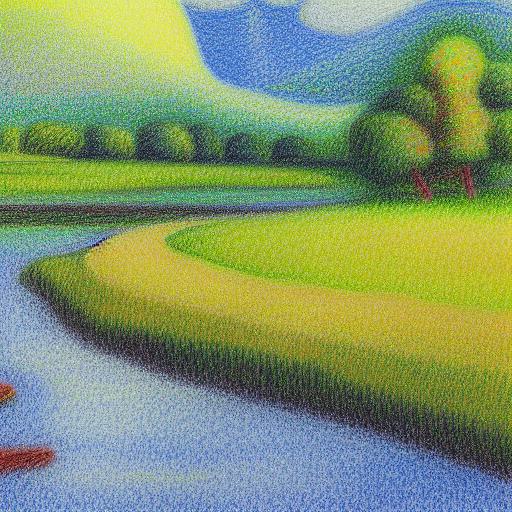 A painting of a river surrounded by a farm