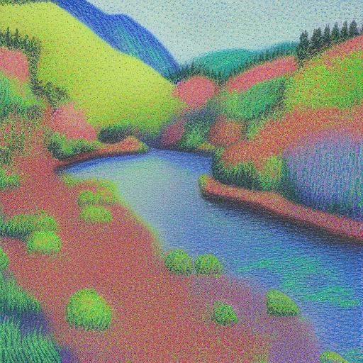 A painting of a river surrounded by flowers