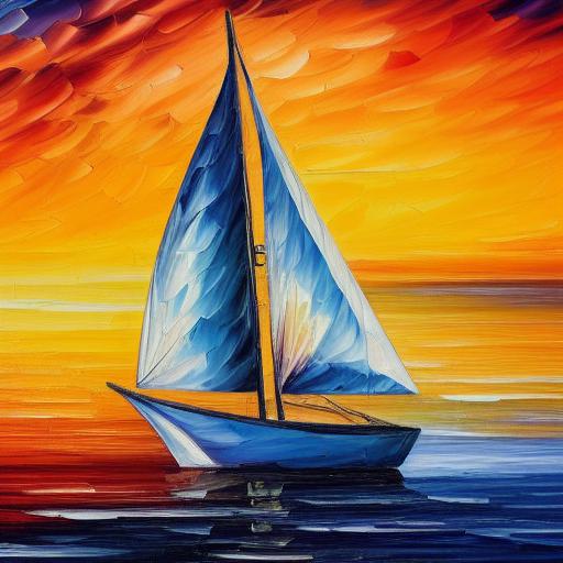 A painting of a sailboat at sunset with the sea