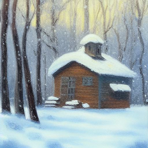 A painting of a small house in a snowy forest in winter