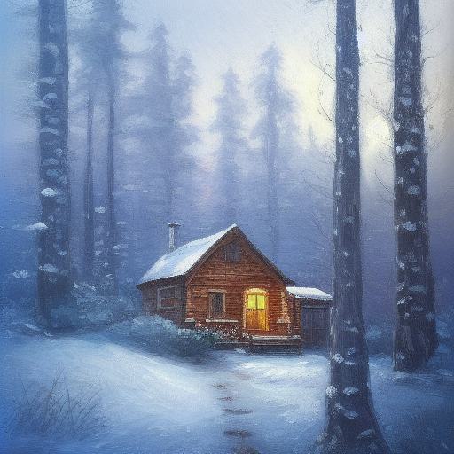 A painting of a small house in a snowy forest