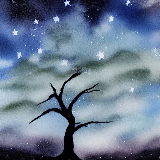 A painting of a tree silhouette in the night sky