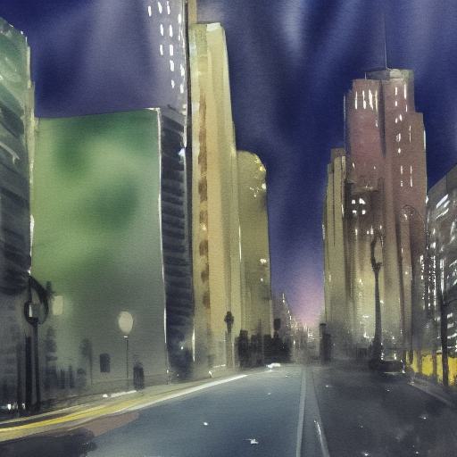 A painting of a view of the city and buildings at night