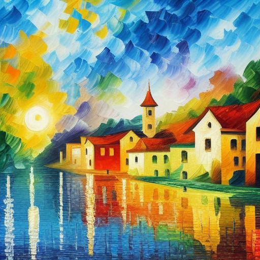 A painting of a village with water