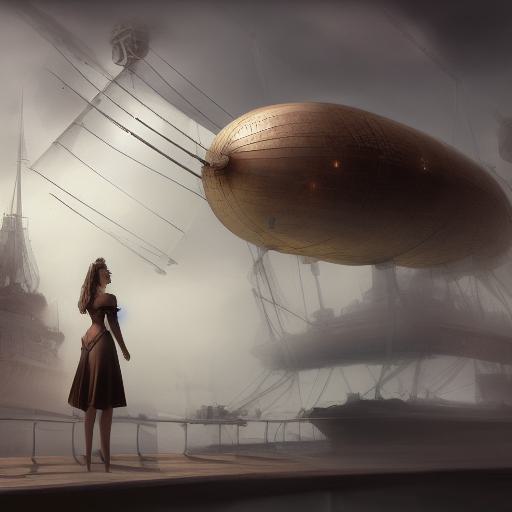A painting of a woman standing in front of a giant ship