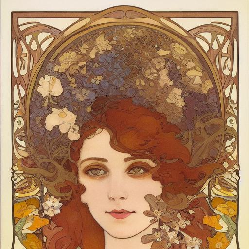 Overall, the prompt guides the AI to generate an Art Nouveau painting of a woman with flowers in her brown hair. Drawing from influences such as Alphonse Mucha, Art Nouveau, and the Pre-Raphaelite movement, the resulting artwork will embody intricate details, flowing lines, and a harmonious fusion of nature and the female form. The use of Pinterest as a reference source expands the creative possibilities, ensuring a rich and diverse artistic interpretation.