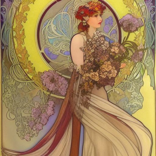 Drawing inspiration from the art nouveau style and the influence of Alphonse Mucha, the resulting artwork will embody the essence of this captivating artistic movement. Art nouveau, known for its sinuous lines, organic forms, and intricate ornamentation, will infuse the painting with a sense of elegance and sophistication. The influence of Alphonse Mucha, a prominent artist associated with art nouveau, will shape the composition, lending it his distinctive style characterized by flowing lines, delicate details, and a focus on the female form.