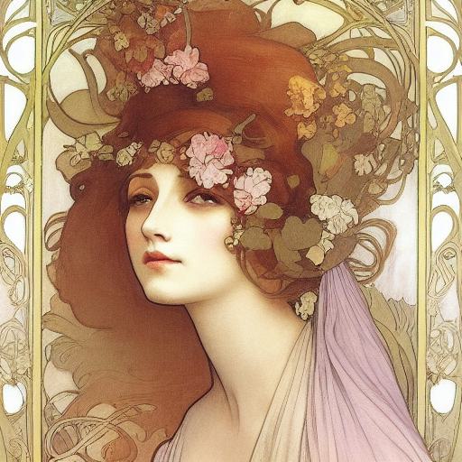 • Alsphonse Mucha” provides an additional reference for the AI to use when generating the image. Mucha’s style is characterized by intricate details, flowing lines, and a focus on nature and the female form, all of which will likely be incorporated into the generated image.