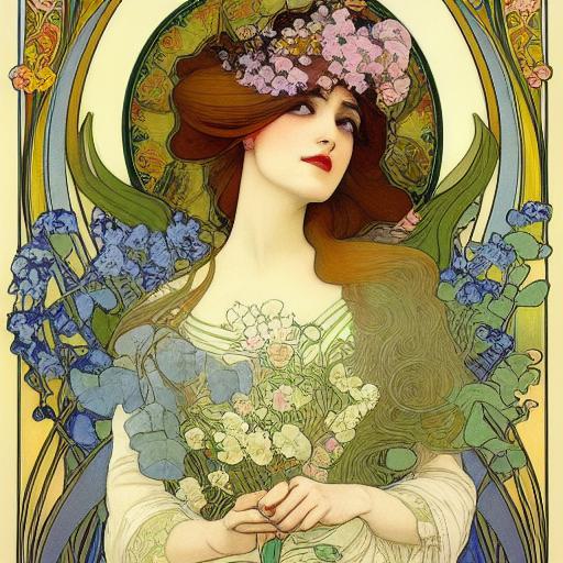 • An art nouveau painting inspired by Alphonse Mucha: This reference to the art nouveau style, inspired by the renowned artist Alphonse Mucha, sets the tone for the artwork. Art nouveau is characterized by flowing lines, organic forms, and intricate details, often featuring graceful women as central figures.