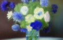 About A painting of beautiful blue flowers in a vase on a table