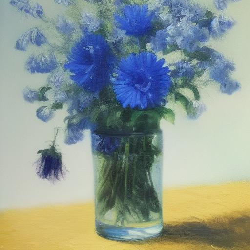 A painting of blue flowers in a vase