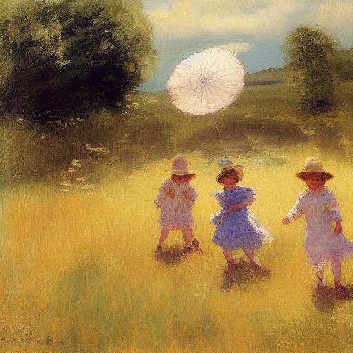 A painting of children playing in a field