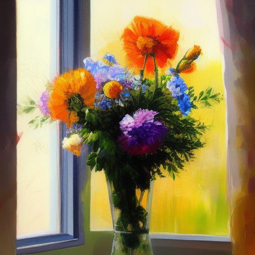 A painting of flowers in a vase on a window side