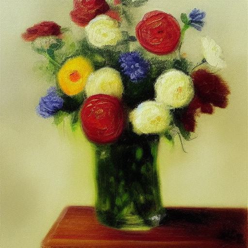 The first part of the prompt specifies that the image should be a painting of flowers in a beautiful vase on a table. This sets the subject matter of the image and provides a starting point for the AI model. By specifying that the flowers are in a beautiful vase, the model is guided towards creating an image that emphasizes the beauty and elegance of the composition.