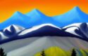 About A painting of mountain and trees with a sky