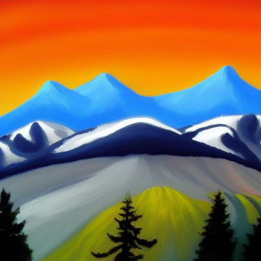 About A painting of mountain and trees with a sky