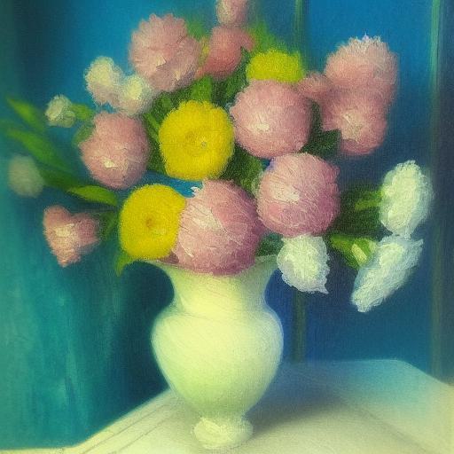 A painting of pretty flowers in a blue vase on a table
