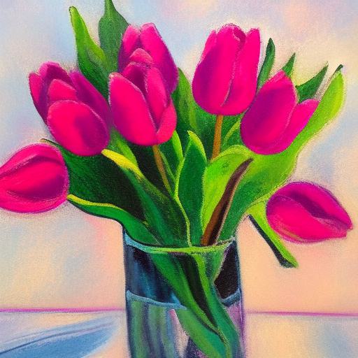 A painting of several pink tulips in the vase