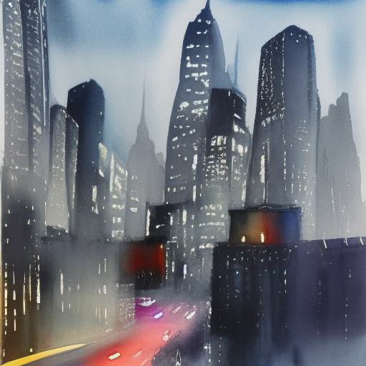 A painting of the city and buildings at night