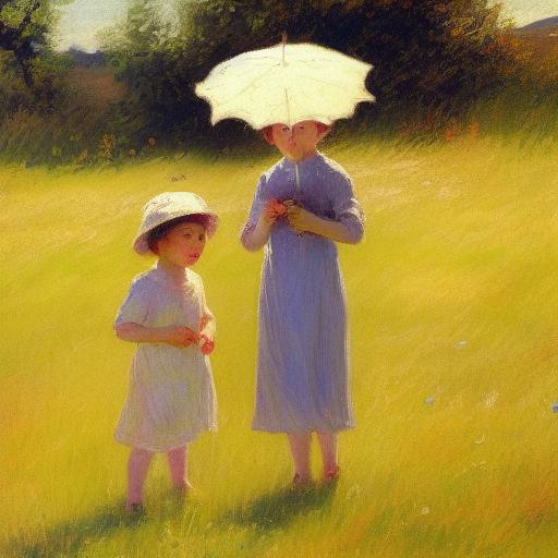 A painting of two kids in a field