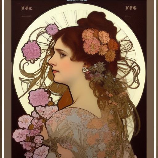 At the heart of this prompt is the captivating image of a woman adorned with delicate flowers nestled in her brown hair. This central motif exudes a sense of natural beauty and allure, evoking a connection to the enchanting world of flora. Inspired by the masterful artistry of Alphonse Mucha, renowned for his iconic art nouveau style, the painting aims to capture the essence of elegance, grace, and artistic expression.