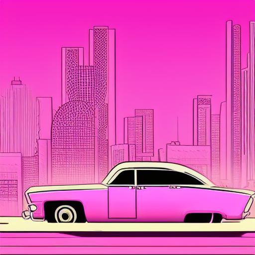 A retro pink car driving on a street at night