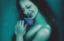 - Action: The woman is holding a laughing flower in her hand. This creates a sense of playfulness and whimsy.