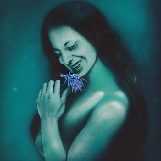 - Action: The woman is holding a laughing flower in her hand. This creates a sense of playfulness and whimsy.