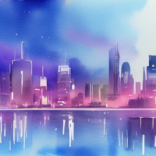 A watercolor drawing of a cityscape with night sky