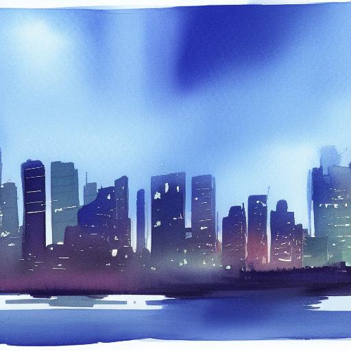 A watercolor drawing of a view of a city with buildings at night with sky