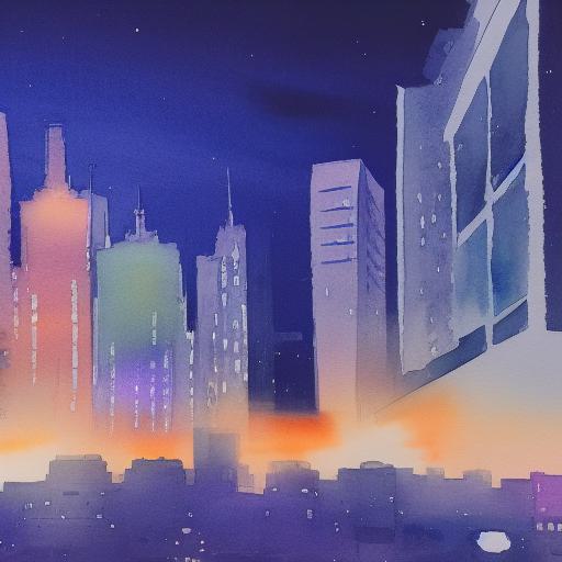 A watercolor drawing of a view of a cityscape and some buildings at night with sky