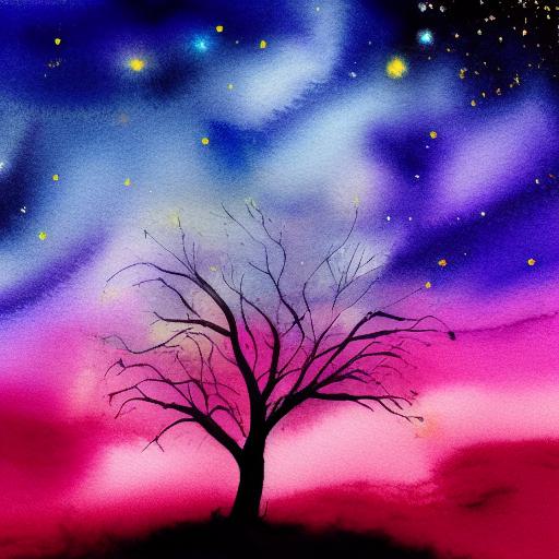 A watercolor of a night sky with a tree silhouette