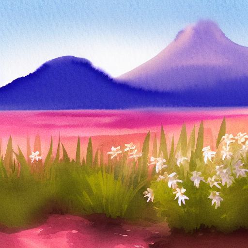 A watercolor painting of a field of lily with a mountain in the background at night time