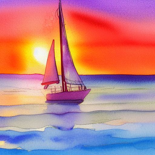 A watercolor painting of a sailboat in the ocean at sunset with big sea waves and sunlight beams