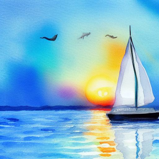 A watercolor painting of a sailboat in the ocean at sunset with dolphins
