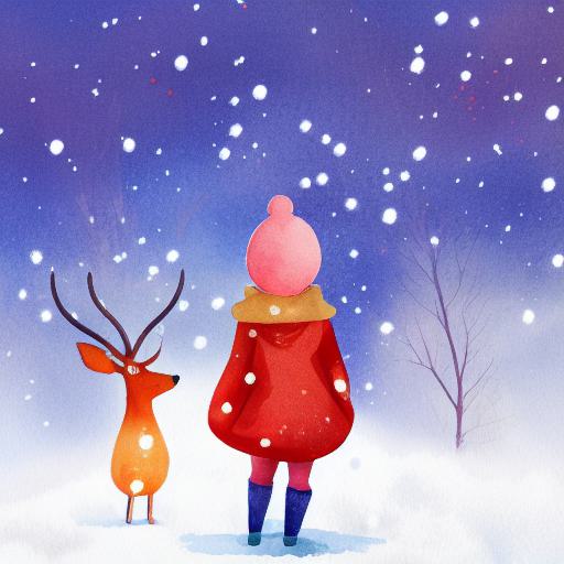 A watercolor painting of little girl wearing a red hoodie facing backward standing next to a deer and a snowman in the snow