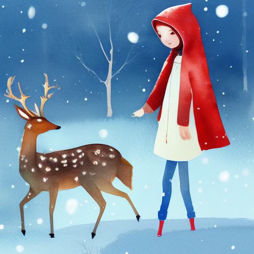 A watercolor painting of little girl with red hood facing backward siting next to two deer in the snow