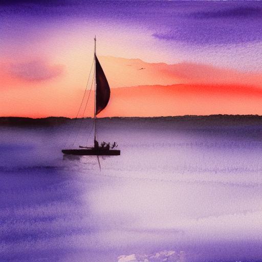 A watercolor painting of of a man standing on a sailboat in the ocean at sunset with a serene purple sky