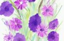 Finally, the prompt specifies that the flowers should be purple, which is a specific color that will play an important role in the painting. The use of purple will help to create a sense of harmony and balance in the painting, while also adding depth and dimension to the overall composition.