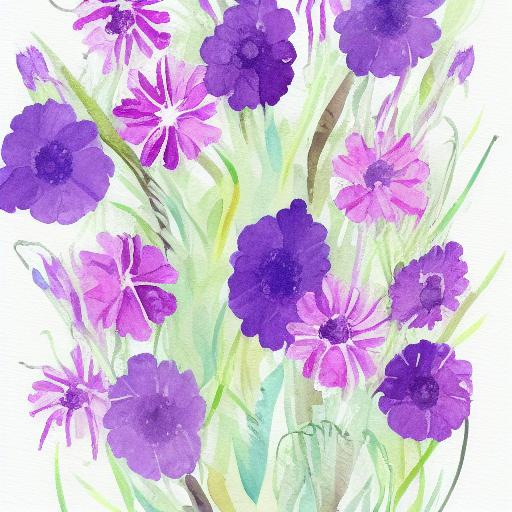 Finally, the prompt specifies that the flowers should be purple, which is a specific color that will play an important role in the painting. The use of purple will help to create a sense of harmony and balance in the painting, while also adding depth and dimension to the overall composition.