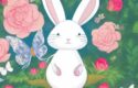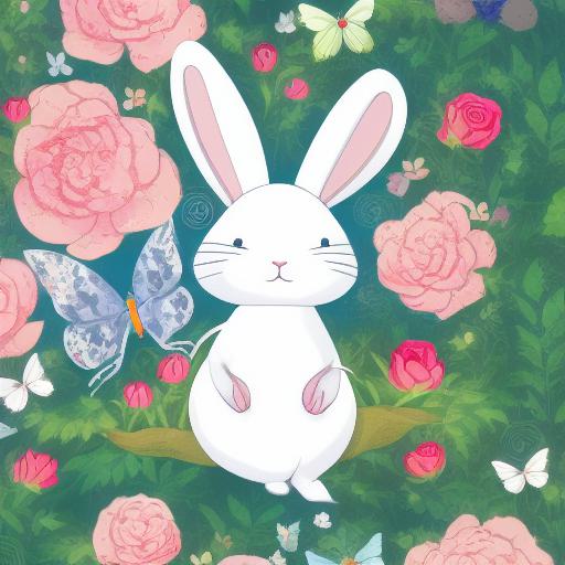 About A white rabbit sleeping in the middle of a forest with roses and butterfly