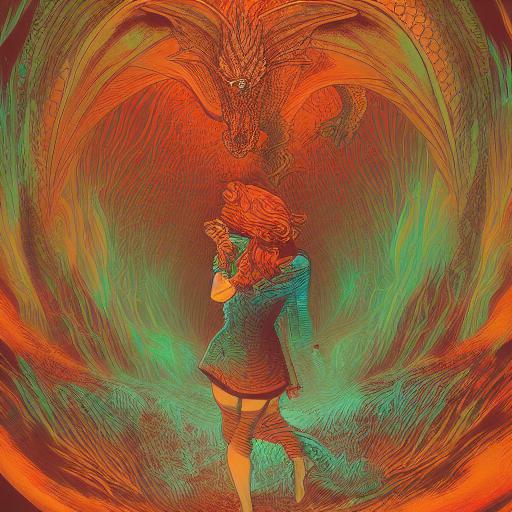 A woman that is standing in front of a dragon in a cave
