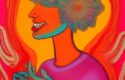 A woman with a laughing flower in her hand is depicted in a psychedelic art style. The painting has an ultra wide-angle perspective