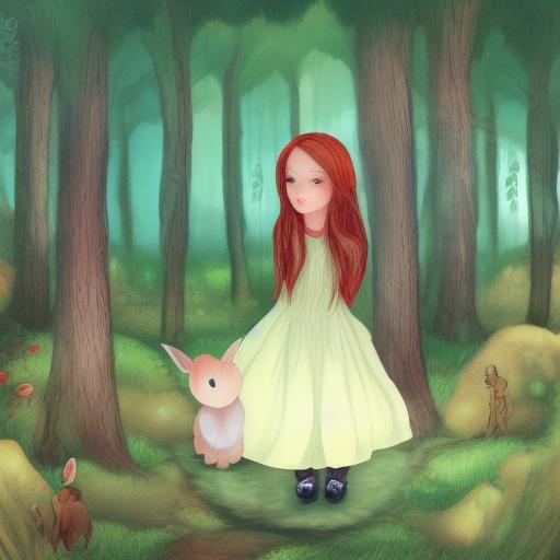 Finally, the prompt includes a specific scene for the girl, Alice, going down the rabbit hole, which provides further context for the image. This information helps the AI system to create a narrative within the image and may influence the composition, with the young girl positioned in a way that suggests movement or progression.