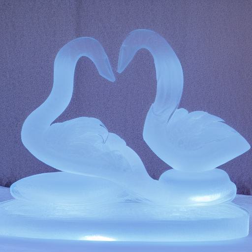An tranquil ice sculpture of two glowing ice-made swans on a wave
