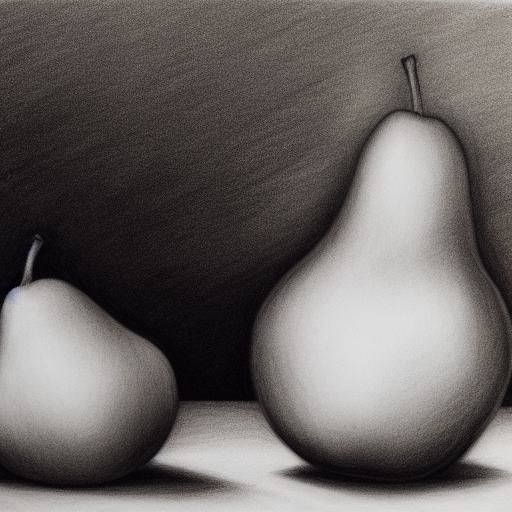 Black and white drawing of a pear and an apple on a table