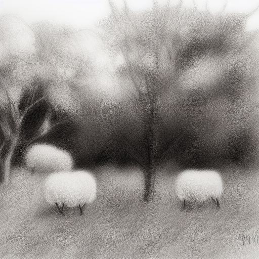 Black and white drawing of sheep and trees in rural area