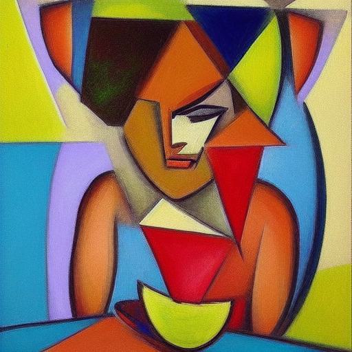 Cubism painting of a beautiful child sitting at a table with fruit trees