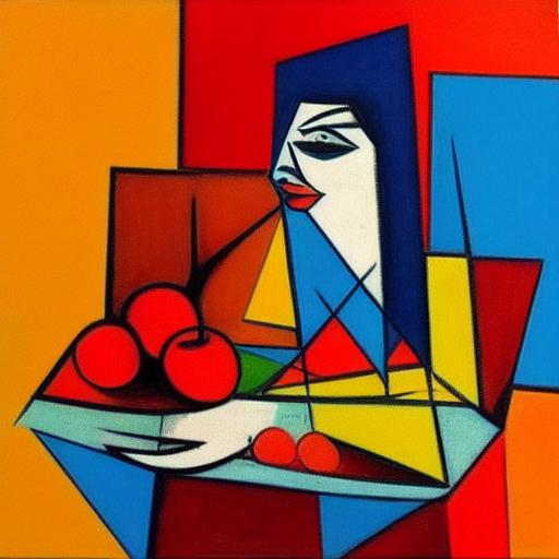Cubism painting of a beautiful woman sitting at a table with fruit tress