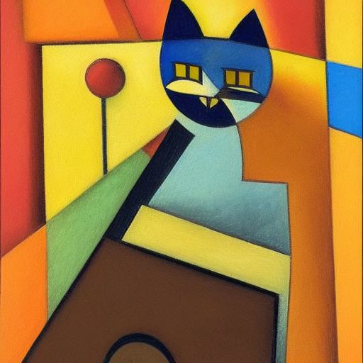 - “Cubism painting of a beautiful cat sitting at a table with fruit trees”: This provides a specific visual reference for the artist to work with, suggesting that the image should feature a cat, a table, and fruit trees as the central focus. The use of cubism suggests that the image should be created in a highly stylized and abstract way.